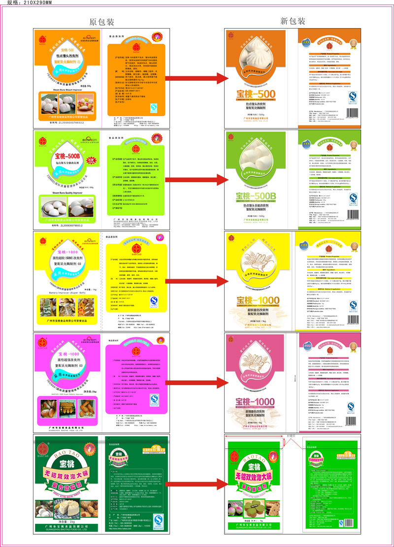 感谢您一直以来对我司的支持与鼓励,陪同我们一起走过十年岁月。为顺应企业发展需要,我司在广州市南沙区东涌镇购买了新厂房,包装需要更改新地址,故从2013年6月起,我司生产的宝桃-500包点馒头改良剂、宝桃-500B包点馒头全能改良剂、宝桃-1000超强面包改良剂、宝桃-1000超软面包改良剂、宝桃无铝双效泡大粉及无糖烘焙甜味改良剂的袋装包装进行了升级换代,与旧包装相比,新包装更加简洁大方和美观,除包装有所改变外,所有产品工艺配方品质都保持不变,请广大客户知悉并放心使用。