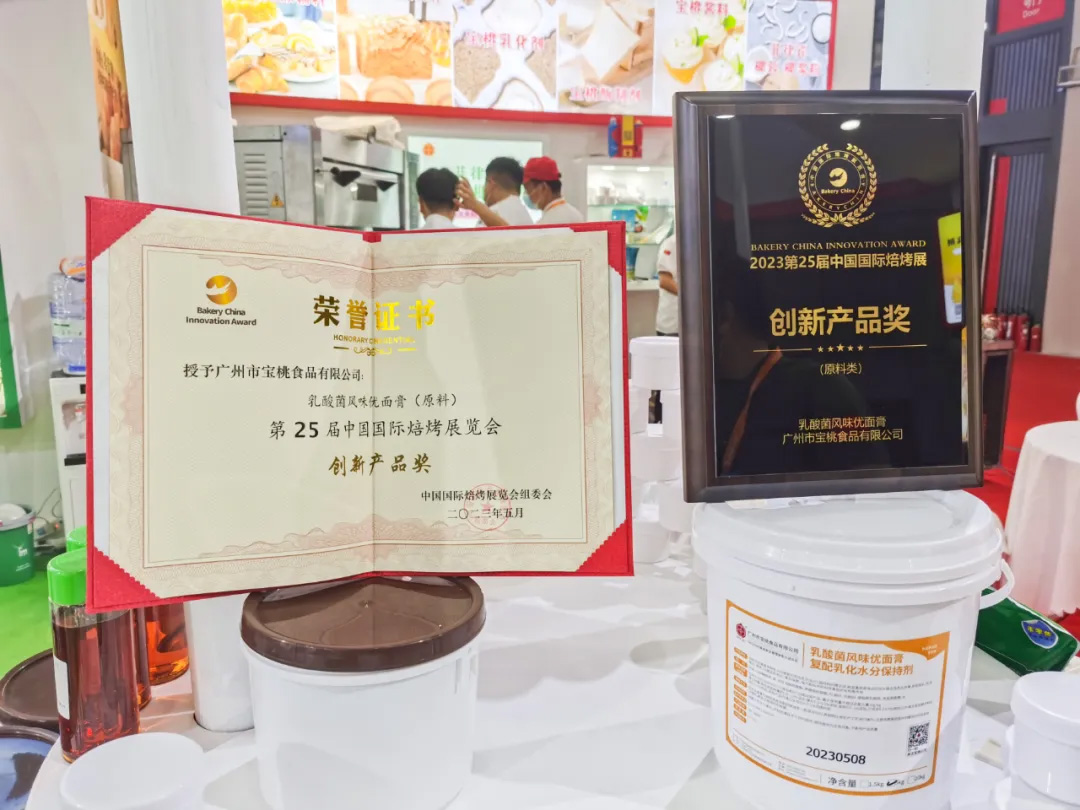 创新产品奖是一个备受瞩目的奖项,它旨在表彰那些在市场上有突出表现的创新产品。宝桃公司推出的乳酸菌风味优面膏,可以在面团中发酵产生乳酸,降低面团的pH值,能够增强面团的弹性和延展性,增强面团的发酵力、增大体积,产生更多愉悦发酵风味,使得成品更加柔软、有弹性,有助于提高成品的风味、口感和品质。此外,乳酸菌还能够抑制其他细菌和霉菌的生长,有助于面包等产品保持新鲜并延长货架期,是一款健康的有独特风味的食品乳化剂。