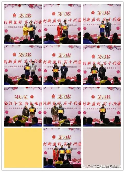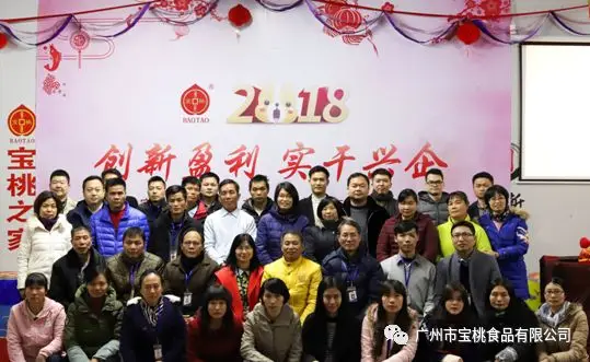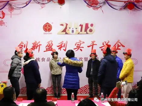 2018年1月30日当天下午,宝桃公司及食而健全体员工在公司四楼员工活动室欢聚一堂,举行广州市宝桃食品有限公司2018年迎春暨颁奖年会,本次年会亮点多多,一是举行首届的美食私享会,二是全员参与的猜字和萝卜蹲游戏,三是节目表演形式丰富。