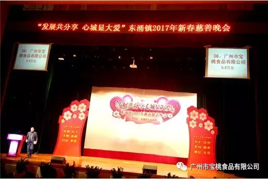 2017年1月13日,东涌镇在镇文化中心举办以“发展共分享,心城显大爱”为主题的新春慈善晚会。爱心企业代表、困难家庭代表、24个村(居)两委成员、全镇公务员、工勤、事编和部门正副职、群众代表等共800多人参会。作为爱心企业之一,广州市宝桃食品有限公司派代表出席了本次活动,并获赠“热心公益,大爱无疆”的荣誉。